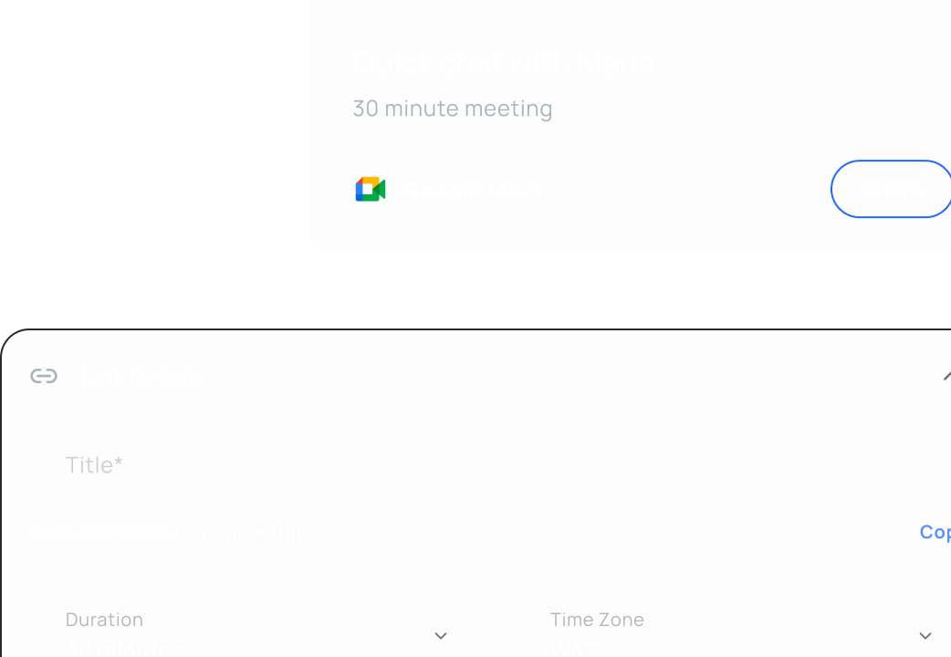 Create up to 3 links for strategy calls, quick check-ins, or coffee chats. Each with different availability windows.