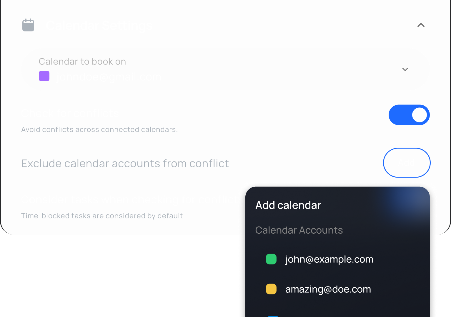 Set meeting title, duration, and location. Choose which calendar meetings get booked to. Add an optional message to send with the link.