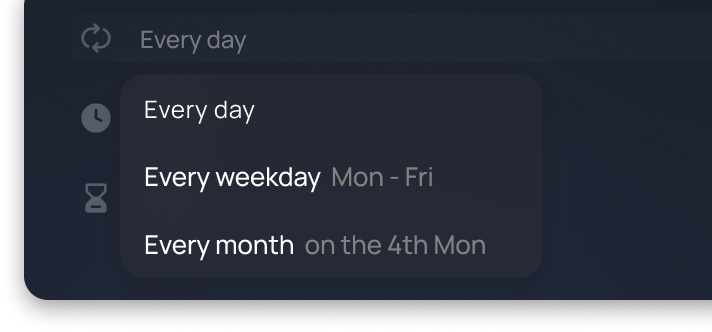 Monthly reports. Weekly newsletters. Sprint planning. Some work doesn’t have a finish line. Create it once as a recurring task and rivva makes sure it shows up every time you need to get it done.